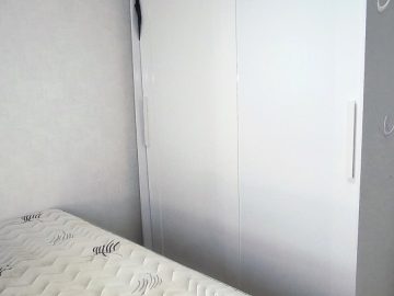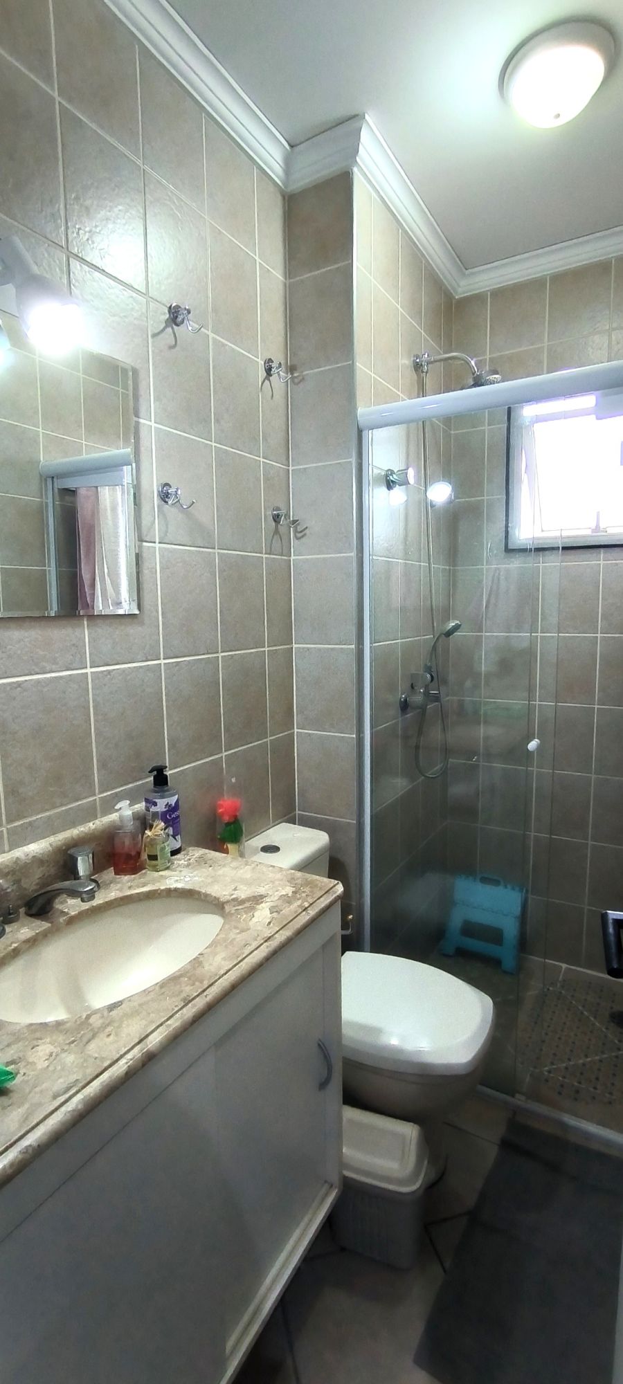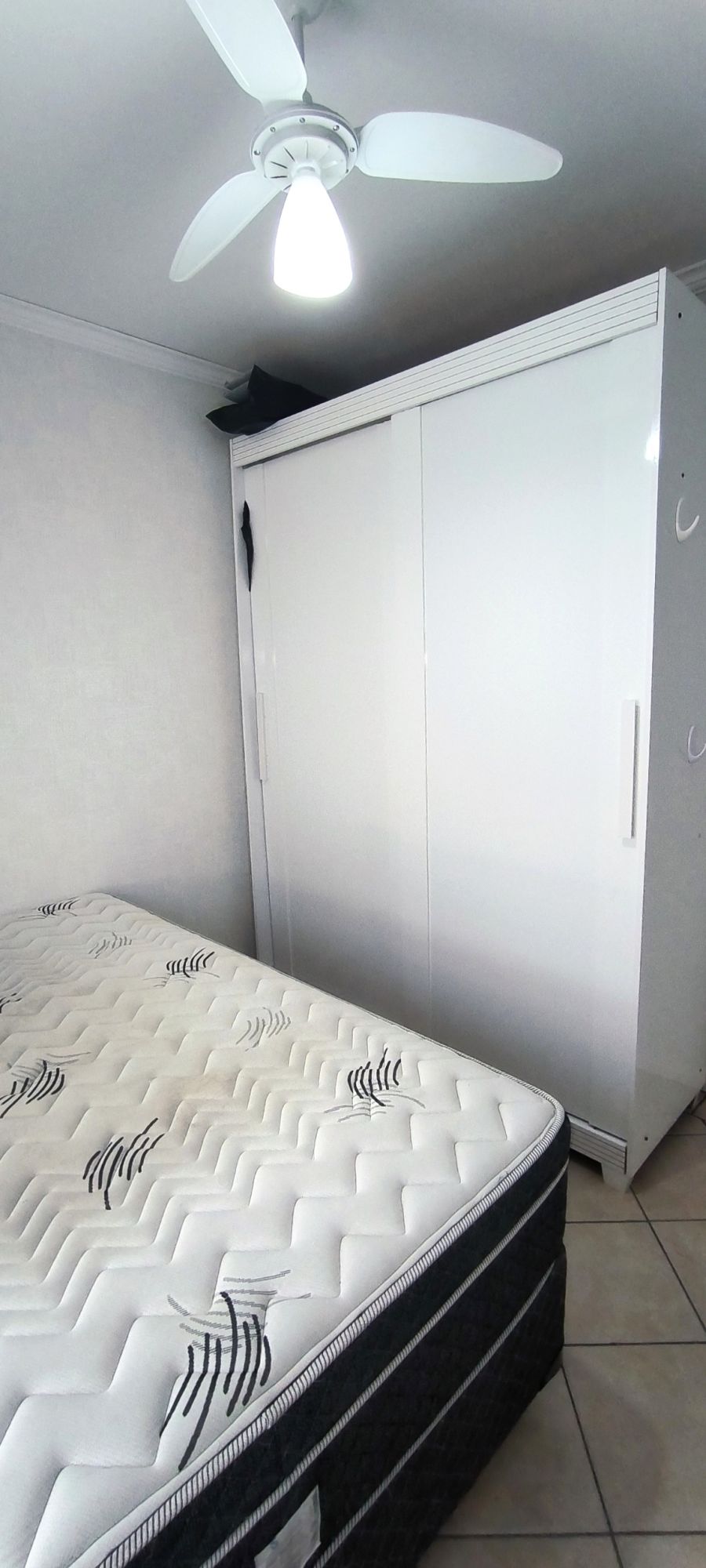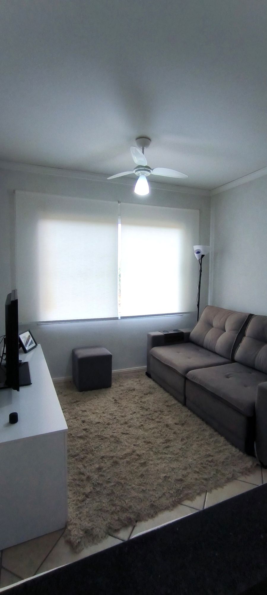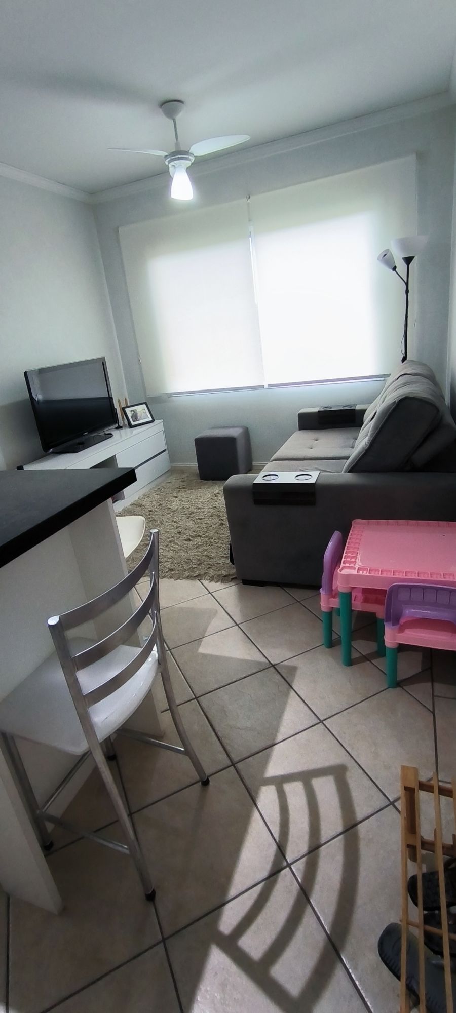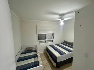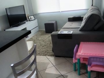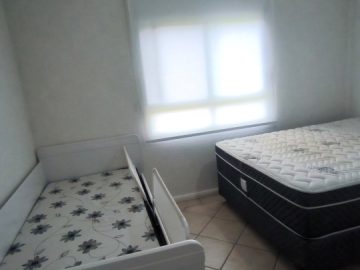 reclinável. Quarto com cama box queen, bicama e guarda-roupas. Apartamento com ventiladores (sala e quarto) e
