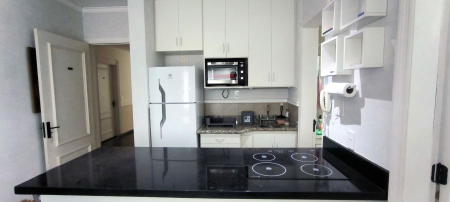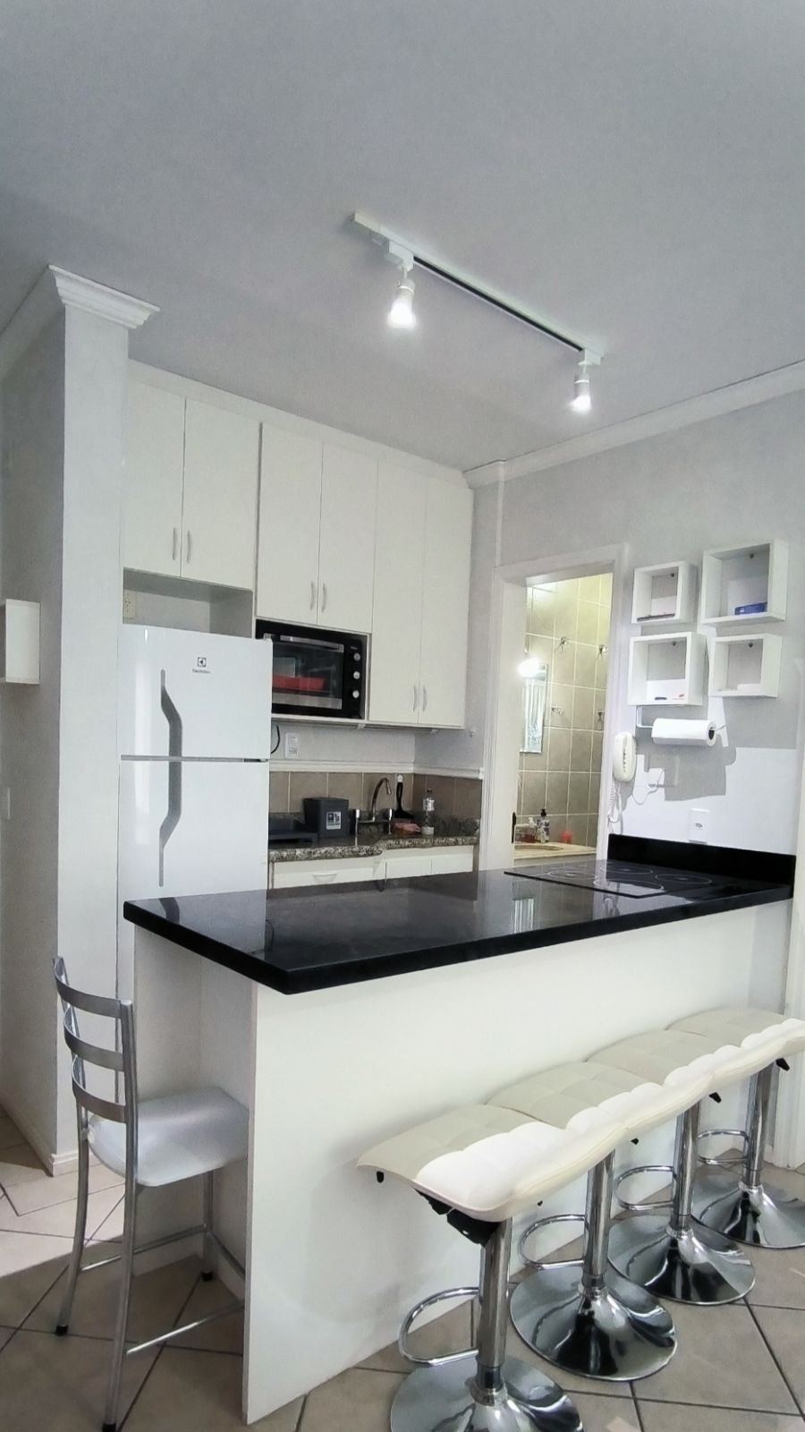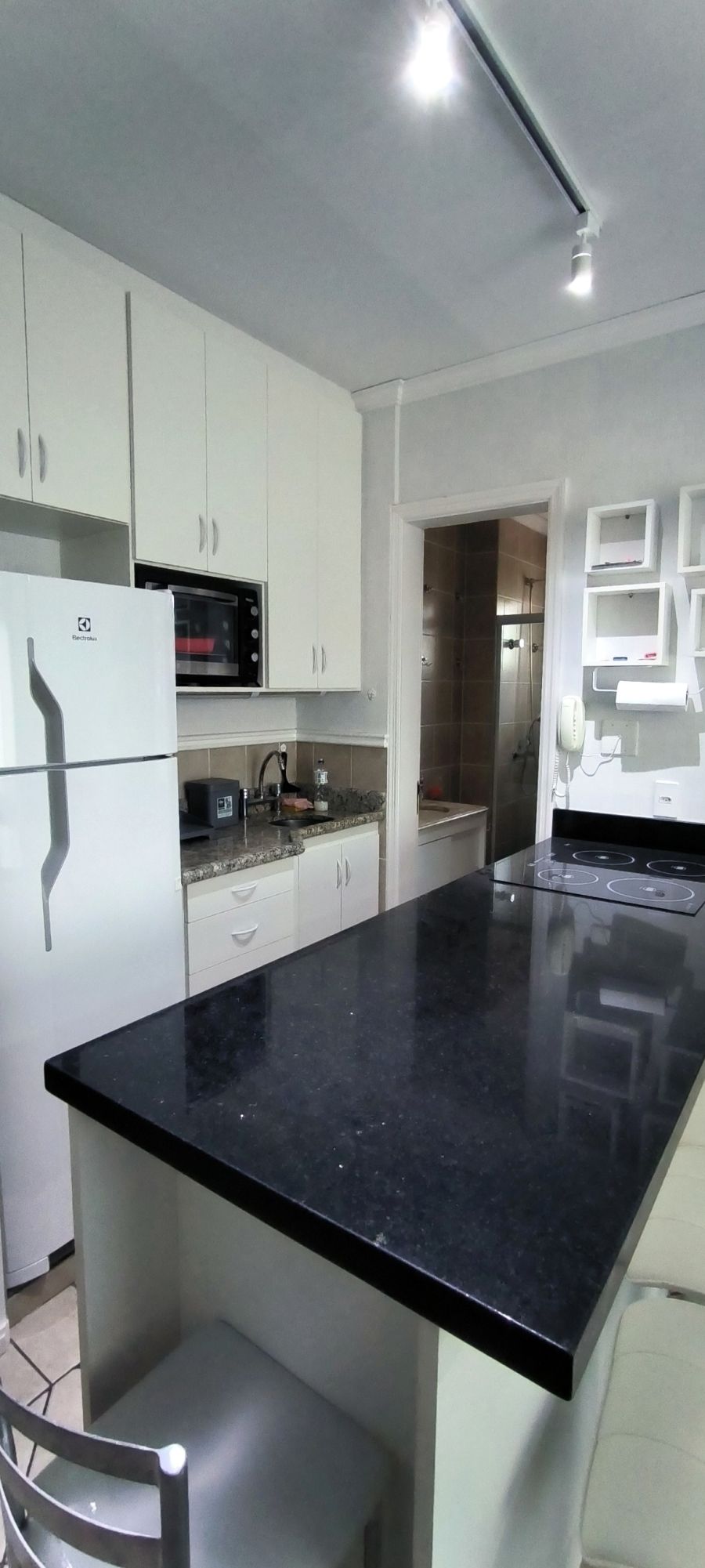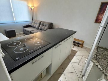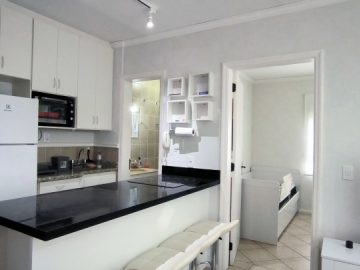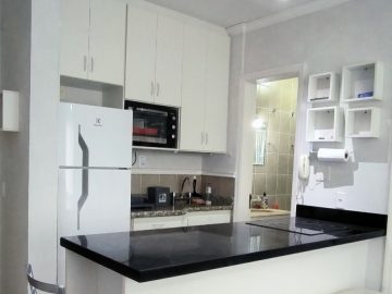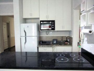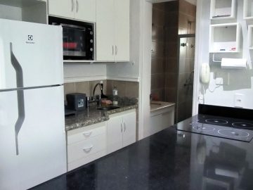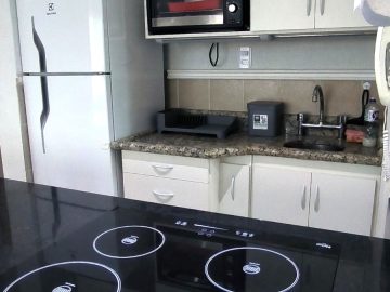 elétrico, micro-ondas, geladeira, bancada com banquetas. Sala com TV de 40 polegadas, sofá de 2 lugares retrátil e